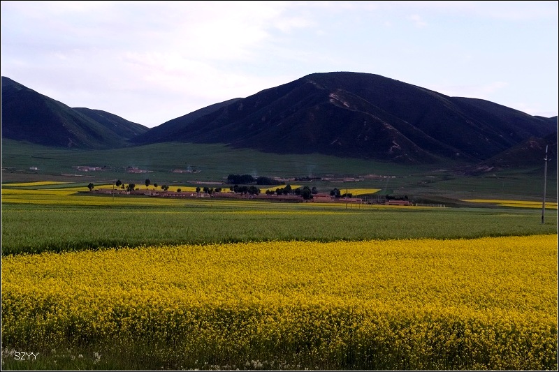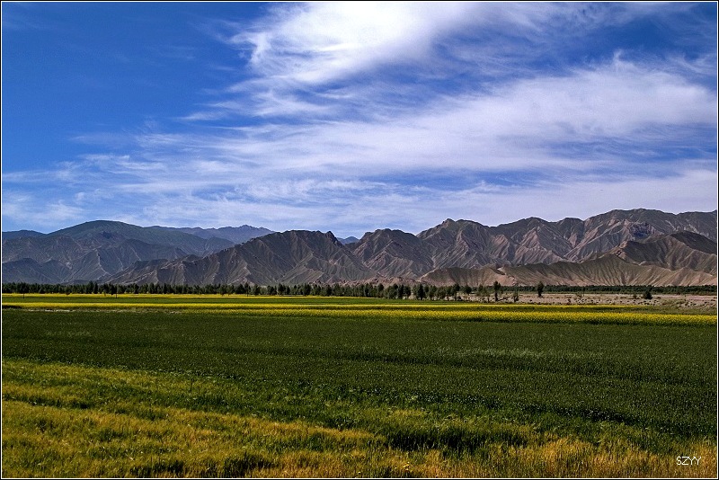 也不知道走了多久,终于进入都兰境内,过脱土山、海拔3088米的呼兰山口,下了山,就看见眼前景色为之一变,出现一片绿洲,真正是沙漠戈壁中的绿洲,有了树木农田,有了村庄。原来是到了香日德,过了香日德大桥,在地图上查了查,大桥下的河是柴达木河,难怪这里出现了绿洲,原来是因为有一条河。