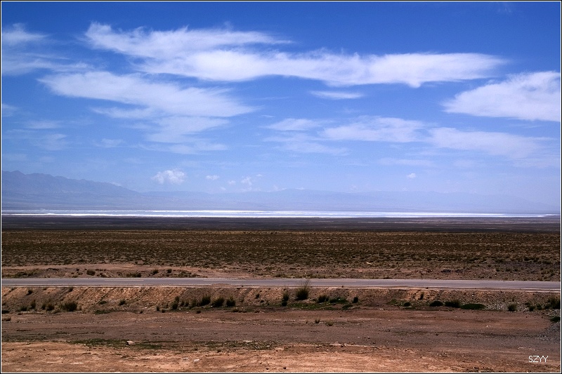 出了城,过收费站,往西宁方向,进入无人区。左侧是一望无际的柴达木盆地,右面是连绵不断的橙黄色的布尔汗布达山脉,景色极为单调乏味,除了沙漠中星星点点的红柳外,几乎没有绿色。开车很容易困乏,先是北方郎开,然后换达咏,这段路很长很长,似乎永远走不完一样,他们开车,我们就在后面睡觉,睡了几觉,醒了几次,外面的景色似乎没有任何变化,也很少看到其他车辆,就我们一辆车,孤零零地在一望无际的平原上飞驰,甚至让人产生一种幻觉,就是在玩游戏机,持续着开车的同一个姿势,一坐就是几个小时,确实很累。笔直的道路延伸到天边,车速很难控制,因为周围近处没有什么参照物,稍不小心就达到一百五六十km/h,甚至达到180km/h,也不觉得快,看看时速表,才发现,赶紧把速度降下来。