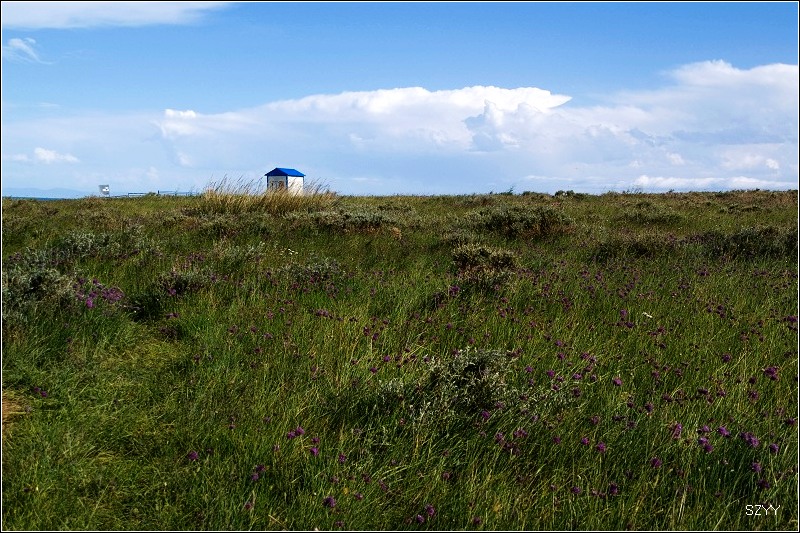岛上景色非常漂亮,草地上开满野花,由于地势高,看着湖面视野非常开阔,深蓝的湖面,蓝天上飘着白云,一个孤立的石头岛上,落满了鸬鹚,此外还有一些棕头鸥,其他鸟没看到。用广角镜头拍了几张全景,然后换长焦拍鸟。因为只有两种鸟,也没什么好拍的,所以主要是拍周围的景色了。