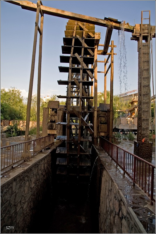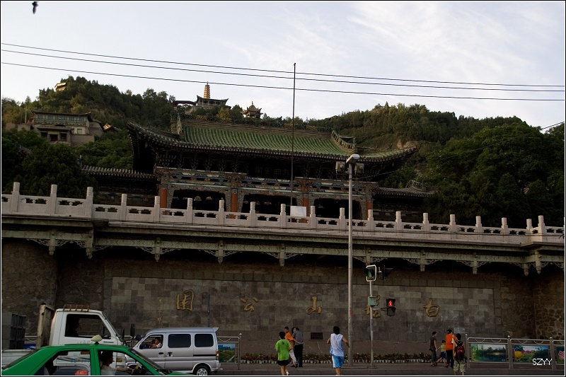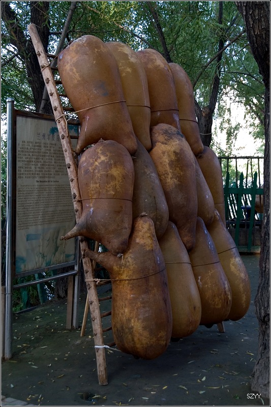 中午到兰州,炫铭的车已经等在路口,安祥也在车上。本打算同学见面,吃个午饭就继续赶路,炫铭不同意,说至少要住一晚上,中午两位同学带我们吃了兰州的一些特色菜,我也记不住菜名,我一向记不住菜名的。安祥电话联系好兰州饭店中楼,带我们去住下。让我们先睡一觉。下午,安祥有事,要陪省长一起去,他一向很忙。炫铭也很忙,不过相对自由些,他开车来,带我们去了黄河母亲、水车园、黄河上的中山桥游览,又乘坐了极富地方特色的羊皮筏子,然后开车去了兰山公园,兰州城南面的一座高山,可以俯瞰整个兰州城。天已经黑了,由于没带脚架,只好把相机按在栏杆上拍了几张兰州的夜景。