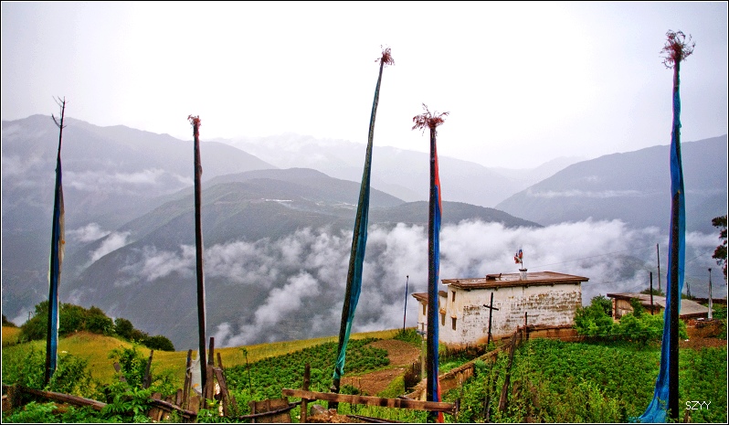 第九天(7月22日)战略大转移 本来还想看运气,早晨是否能放晴,拍到梅里日出,所以昨晚专门问好了平时日出的时间,上了闹钟,早晨醒来一看,仍然在下雨,于是按原定计划,不吃早餐,走德荣,我和北方郎叫了达咏和老严,到了楼下,客栈老板还没起床,打开客栈的门,广州光头的4500已经等在外面。 我们把行李装车,等着关老师和老板结帐,黑暗中两个当地人走过来,光头上前问了问,当地人说德钦过去一点,整个山体塌了下来,光头立刻把消息告诉我们。如果真这样,我们就连德荣也不能去了,到底该怎么办,我们决定还是先探探路,于是我来开车,因为后面还有更难走的路由北方郎和达咏开。 光头的4500和老曲的宝来跟在后面,下着雨,天黑沉沉的,云雾弥漫,能见度只有几十米,我打开大灯和雾灯和警示灯,小心翼翼地向黑暗中驶去。这时不知道其他人怎样,我心里还是有一丝恐惧的。边开车边想起一部美国电影里的情景,电影名字忘了,就是描写火山爆发的时候,一个人开车逆着逃难的人流,顶着四处飘落的火山灰和落石,找寻家人的事。因为我们这时的处境也不妙,周围的山体也随时有可能滑塌。这时后面赶上来一辆当地的微型面包车,开的比较快,很快没入黑沉沉的云雾中了,我大着胆子跟上去往前开,只要不看到前面的车被拦住或倾覆,就说明没事,豁出去了。走过几个路段,有不少山上塌下来的泥石,看着比较凶险,一边瞪大两眼,随时查看山上和路面的情况,一边迅速通过,此处不可久留。 谢天谢地,终于看到德钦县城了,这段路算闯过来了,没看到山体把路面全部掩埋,这时看到了前面那辆当地的小微型面包,停在一个小铺前,县城没几家亮灯的,停下来问了问藏族司机,他说他也去奔子栏,现在先喝喝酥油茶,让我们一会儿可以跟着他。我们谢过了他,不准备等了,因为我们今天的路很长,任务很重,所以就先走了,天逐渐亮了些,路面上有许多昨晚从山上掉下来的石头,小心谨慎,第二次驾车翻过白马雪山,前天开车第一次翻越时我看到一个山谷比较凶险,雨天很容易形成泥石流,回来时我最担心的这个山谷没出现塌方,算是运气。