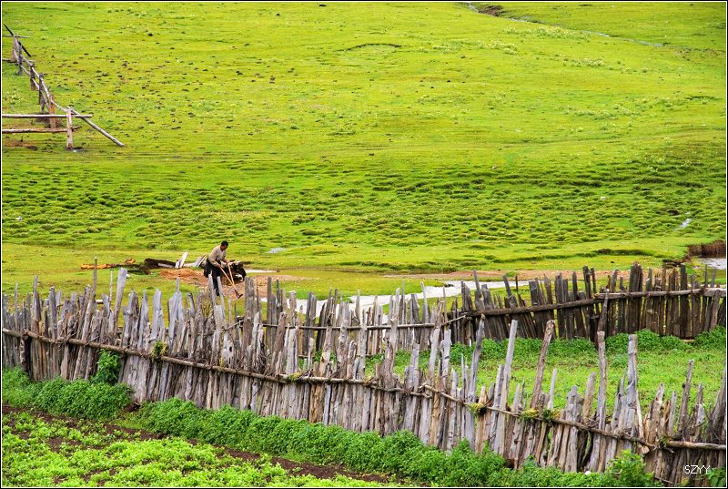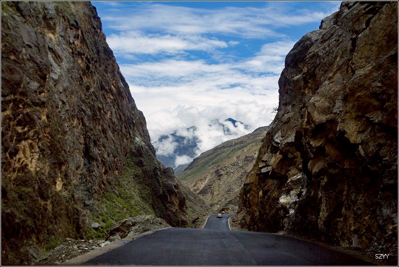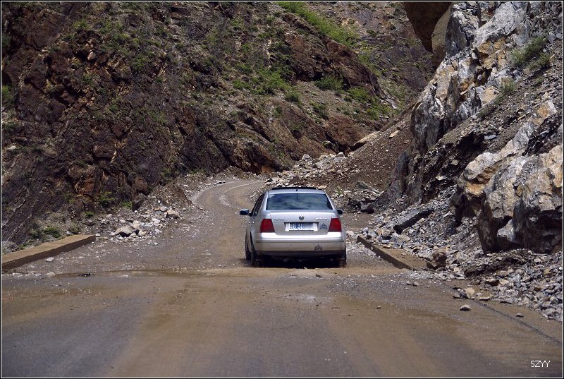 老郎开车,路面倾斜,斜向峡谷下方,四驱车的轮子也打滑,并且是侧滑,极为恐怖,一旦滑下去,可就什么都没了。开过来之后,老郎说他汗毛直竖,手心直冒冷汗。刚开过这个险段,我发现前面不远处有一大片灰土冲天而起,我心里一惊,这种雨天,不可能有那么多干的尘土,一定是前面山体滑坡了,看方向正在我们前面,万一把我们的路阻断,我们可就惨了,赶紧跟大家说,我们都紧张地盯着前面,好在我们的路在距离尘土几十米的地方向左拐了一个弯,绕了过去,向右一看,果然是半面山崩塌了下来,进入江里,这时正好看见一个小村子,村里的人包括红衣喇嘛都吃惊地张着大嘴,瞪着眼睛看着我们的方向。他们看的是崩塌的山体,看的也是我们,因为我们的车正从山崩的方向开出来,他们吃惊也就很正常了。