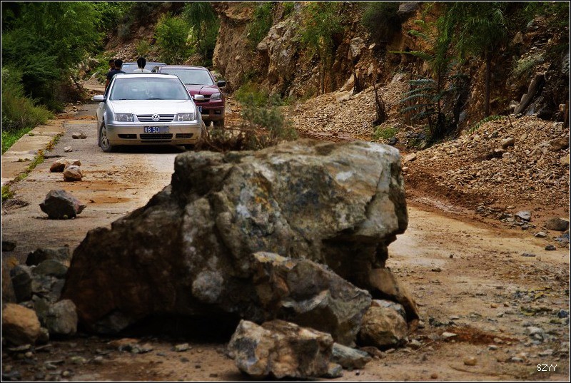 再走,又一次进入艰险路段,左侧是深深的金沙江大峡谷,浑浊的江水咆哮奔流,气势磅礴,右侧是万仞绝壁,怪石嶙峋,天下着蒙蒙细雨,泥路窄滑,可是我们实在抵御不住大峡谷的诱惑,冒险绝壁停车,拍拍峡谷的景色。老曲的车超了过去,从对讲机里说,我们的车轮胎似乎扁了,我们赶紧回头一看,不由倒抽一口冷气,果然,我们的左前胎已经完全没有气了,这可真不是时候,在这么危险的地方,山上随时会落石头,下着雨,天又马上就快黑了,怎么办?是勉强开出去找一个安全点儿的地方再换胎,可是前面看着都很危险,老曲他们的车略作停留,还是因为太危险,先开走了,达咏当机立断,决定马上换备用轮胎,大家一起动手,齐心协力,拿胎的拿胎,支千斤顶的支千斤顶,倒腾行李的倒腾行李,这时也不记得是谁了,把备用胎立着放在路上,等几个人忙着卸掉暴胎,老郎才发现,赶紧把备用胎放平了,好险啊,万一立着的备用胎没放稳,滚到金沙江的万丈深谷里,我们可就歇菜了。终于,换好了轮胎,整理好行李,可以继续前进了,整个过程历时20分钟,赶紧离开这个是非之地。