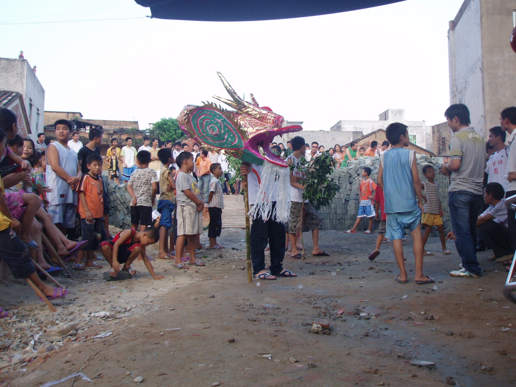 伴和着乡土风味浓烈的民间吹打乐,舞起。龙头威武壮观,银鬓玉角,光彩照人。树仔人认为树木旺树仔。所以龙身用树枝续成。柚子做龙珠在前引舞。龙头昂视、龙珠劲抖,龙身翻腾,龙尾律动。忽跃忽伏、时缓时急,如凌空飞腾,如潜海穿浪,如遨游九天。这群村民用淳朴的舞舞着血脉传承,舞着对上天的敬畏,舞着对祖辈的敬意。