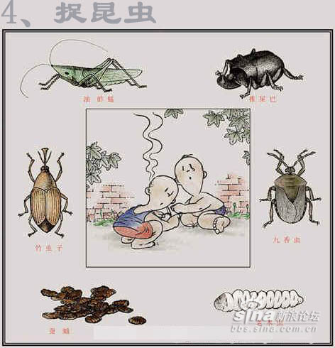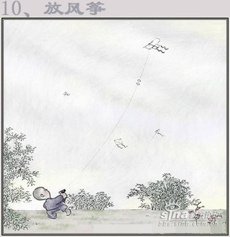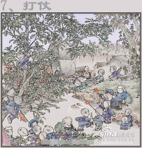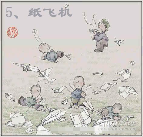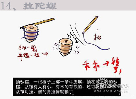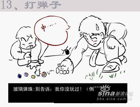 一到十六项,除了放风筝没兴趣外,其余的都玩过了。 1、捏泥巴男孩经常都捏坦克之类的。 2、吃桑树仔我吃过,不过要红中带紫的才是最好吃的。吹肥皂经常用笔管来吹的。 3、捉昆虫印象很深刻,东阳北街的龙眼树几乎我都爬过了,爬来干什么呢,当然是捉放屁虫了,有次被房屁虫的尿射中了眼睛,搞的连续几天都涩的睁不开眼睛。 4、跳人是我小学四五年纪也很流行的活动,不过那时候我动作还是很敏捷的,可惜家人没发觉我的天赋,如果送我去体校深造下说不定奥运会也有我的份了。 5、弹波仔也是小学的玩意了,不是吹牛我小时候弹波仔的眼界可以和王易夫较量了,曾经靠几粒波仔就赢了两三罐(装奶粉的铁皮罐)满满的波仔,还赢了一把锁(按当时的物价锁也不是便宜之物)都十几年了到现在还能用,可见那时候的国产货还真是有质量保证的。 6、纸飞机经常是撕作业本来折的,经常和同学们一起比赛看谁的飞机飞的远。不过那时候折法很单调的,现在已经发展到很多种的折法了。 7、推铁环和陀螺。推铁环已经忘记是什么铁环了,(大家记得的话请告知我也好)不过我还记得推铁环的柄好象是铁丝弯成S壮,套在环里推的。那时陀螺不象现在市面上五花八门的,那时候陀螺世面是没有卖的,都是我们自己动手做的。是用烧柴的木砍成圆锥形在底部放粒钢珠就完成了 7、弹弓,也是自己造的,主要材料是街道两旁的Y字行的树丫,在两头绑着橡皮筋,然后在橡皮筋中间绑一小块废旧的车胎用来包住“子弹”的。