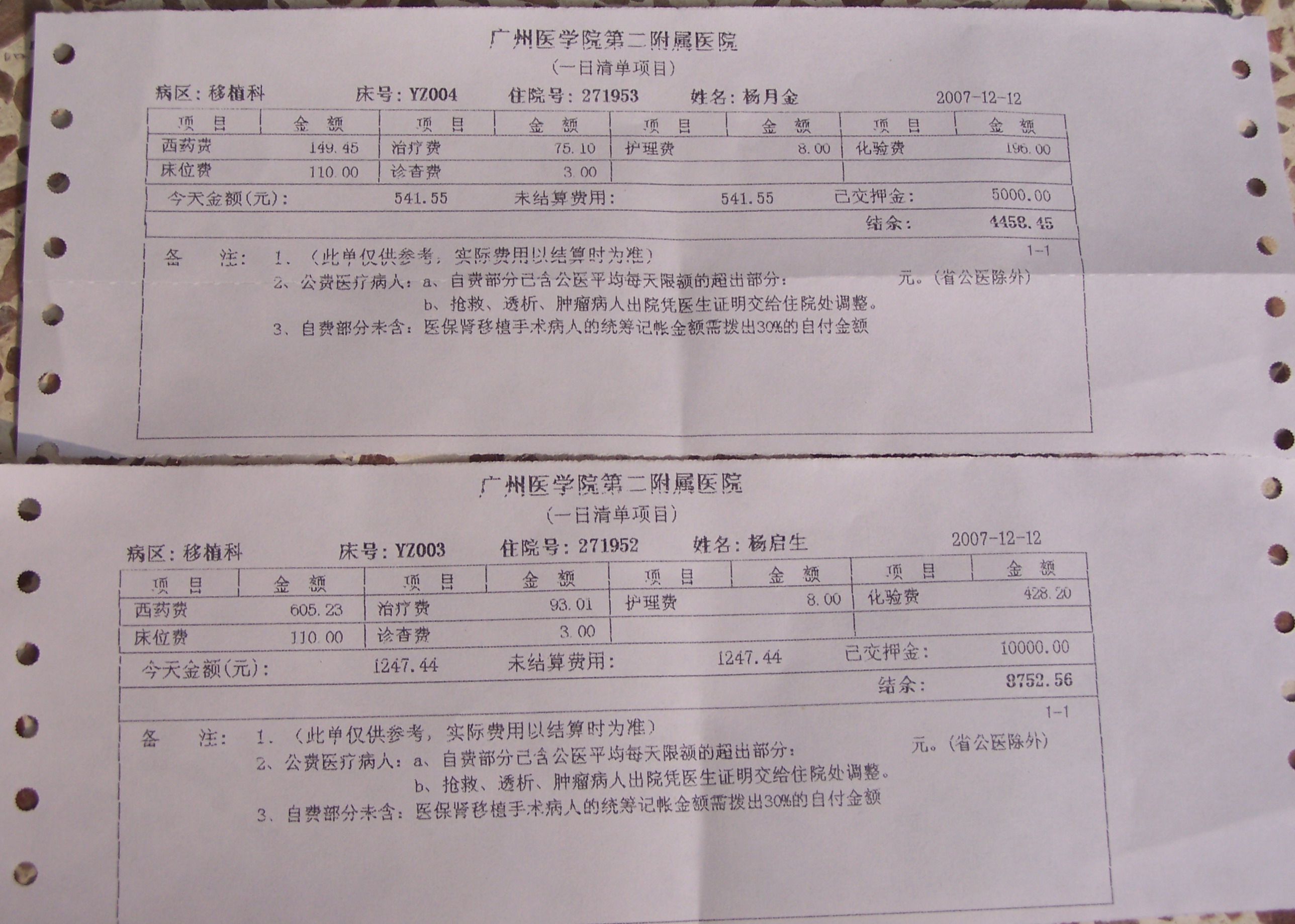 碰巧拿到杨及其母亲的费用清单.每天费用还是蛮高的...
