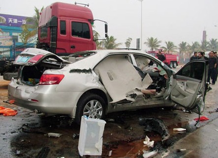 据称,当时受严重撞击后,小轿车不久即起火燃烧。当地交警等部门经奋力扑救并将大火扑灭后,立即用工具撬开小轿车车门进行抢救。由于撞击猛烈,小轿车车头及驾驶室严重损毁,男司机的头颅已被刮飞到地面上,副驾驶位的另1人(女)已血肉模糊、支离破碎;后座上则坐着4人(1男3女),其中3人也已血肉模糊,证实已死;另1人被救出时尚有微弱呼吸,但被救出后在送院途中也证实死亡。