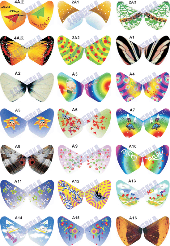 魔幻蝴蝶是新产品,款式丰富,根据具体的蝴蝶上下翅膀的拼合,可有上百种款式,这里提供的只是一小部分产品花色图样、实物照片(如图)。