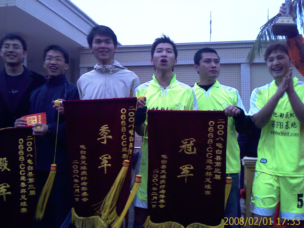 郭靖 荣誉会员 荣誉会员 注册 2007-05-16 消息 2,343 反馈评分 0 点数 61 2008-02-01 #231 2008年第三届“0668.CC迎春杯”足球赛成绩 冠军 21世纪足球队 亚军 补芝林食庄足球队 季军 三角圩青年足球队 殿军 WIFI联盟足球队 最隹射手 两名:林福炳 蔡海