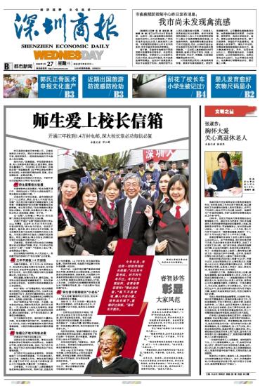 [attachmentid=165346] 偶翻报纸,发现2008-02-27日《深圳商报》刊登文章,报道章校长的有趣事情,特感亲切。特挂网,以便日后浏览 “元旦至兮要考试,时不利兮考不过。考不过兮要挂科,老章老章奈若何?”章必功回复:“阁下不是老项,鄙人不是小虞。挂科远非垓下,重修好过别姬。” 师生爱上校长信箱 开通三年收到1.4万封电邮,深大校长章必功每信必复 本报记者 邓小群 深圳大学校长章必功和毕业生们合影留念。 [attachmentid=165348][attachmentid=165347] 昨天是深圳高校开学的第二天,记者来到深圳大学采访。深圳大学学生陈丹丹告诉记者,到校报到后,一回到宿舍她就打开电脑进入校长信箱。 陈丹丹说:“放寒假前,学校更新宿舍电表,有人反映新电表好像比以前走得快,宿舍用电量增加了。不出所料,校长信箱中,近期排在第一的回复就是《关于学生宿舍电费计收的说明》,大家的疑问得到说明、答复。校长信箱效率一直都这样高。” 记者曾多次到深圳大学采访,不断听学生们说起深圳大学的“校长信箱”。 师生爱看校长信箱 外语学院学生吴佐源说:“校长信箱开通三年,我相信全校2万师生大多数有每天上网先看校长信箱的习惯。” 记者在深大的学生食堂、图书馆随机采访了十几位师生,果然,没有人不知道“校长信箱”,而且绝大部分被采访者都说每天上网的第一件事就是到“校长信箱”里看看有没有新鲜事。学生周文明说:“校长信箱绝对是全校热点集纳。在这里,学校最近的大事小情、热点难点、新政措施,都能一目了然。” 在“谷歌”,记者输入“章必功、校长信箱”,搜索出的相关网页约22300篇。 记者打开通过“谷歌”搜索出的深大学生Alice的博客,在去年10月25日的日志里,作者这样写道:“深大有个好校长,但这还不是重点。重点是,深大的校长有个好信箱。校长信箱其实是个设在深大校园网内的办公系统,为的是方便师生们能在上面提问或发表建议。研究小章校长(章必功校长)信箱已成为我们生活里的主要内容之一。” 记者发现,很多深大师生在自己的博客里对校长信箱进行转载、评述,不少学生把校长称为“小章”、“老章”、“可爱的小老头”等,亲昵程度出乎意外。 校长信箱是内部网络,外人无法进入。吴佐源用他的密码打开“校长信箱”让记者看。 三年不到收1.4万封信 信箱内容繁杂。在2月22~24日的来信中,有反映学生宿舍电费计收有误的,有问物价补助的,有批评考试试卷的,有问候校长元宵节快乐的,有对思想大解放与深大改革提建议的,内容多达几十种。 再往前翻,信箱内容更多,事无巨细。有本科生抱怨宿舍里有蟑螂和蚊子,有失恋学生向校长求助的,有老师对学校发展提出自己的设想的。 学生“借我一生”在博客里说:“校长信箱是深大的特色,信和回复都是公开的。比如早上起来发现袜子没了,然后把问题发给校长,校长再转给保卫处,然后保卫处就奉校长之命帮忙找袜子。先别笑,这绝对是一个形象的比喻。” 学生“洒家杰舍”讲了这样一个故事。她的宿舍在桂庙,周围有很多民房,房间采光很差。一天,宿舍里有人给校长信箱写信,希望校长屈尊来看看。没两天,她们突然收到消息,章必功要来宿舍。由于校长现场办公,事情很快得到解决。 这个信箱实实在在,每天吸引大量师生光顾。校长信箱开通不到三年,收到师生近1.4万封信,内容从学校管理到学术疑问再到情感困惑,大家把信箱当成解决问题的便捷通道。 信箱公开校长每信必复 记者采访了深大校长章必功。 说到设立校长信箱的初衷,章校长说是希望给同学们营造民主的校园文化,构建师生平等、直接对话的体制。他说:“有了这个信箱,相当于两万名师生都在帮助我这个校长管理校园。” 由于师生可以给校长直接写信,学校职能部门工作效率明显提高。不少处室负责人告诉记者,信箱是公开的,章校长每天都回复,分管工作好不好,校长差不多都知道,所以工作不能怠慢,尽量在第一时间解决。 记者看到,不少办公室门上都贴着教师姓名和学生接待日时间。同学们说,这是这两年才有的事情。1.4万封来信,校长每封都会回复。很多同学发现,电脑显示的回复时间有时是凌晨一两点钟。 学生们说,从图书馆位置严重紧缺到增设文科楼、新西南及玉兰园自修室,从宿舍设施老化到粉刷宿舍、更换桌凳,从校园缺少休息场所到现在随处可见的欧式座椅,从校道上人车争道、险象环生到现在的铺设人行道、人车分流,从校园内乱挂横幅标语到现在通过电子屏幕发布信息,每一个变化都与“校长信箱”有关。 学生信中昵称校长“小老头” “校长信箱”赢得师生们信任,校长本人也得到学生们尊重。 2006年11月3日的那一幕让校长章必功非常感动。这天是章必功生日,不知谁透露了这个消息,结果校长信箱里全是祝贺。 一位研究生在祝贺信中写到:“很多大学生连自己校长的名字都不知道,更不用说给校长写信。我们为拥有您这样的校长而骄傲。校长信箱为我们提供了一个提出问题、请求帮助的途径。每一封信您都认真对待,我们知道这花了您很多心血。” 有封信这样说:“亲爱的尊敬的小老头(我觉得这样更加亲切哦),感谢您给了我们这样一个自由的、民主的殿堂。希望我们的小老头今天特别开心。” 还有这样的留言:“老章校长,祝你生日快乐。同学聊天时都这样称呼你,感觉你像邻家的长辈。” 