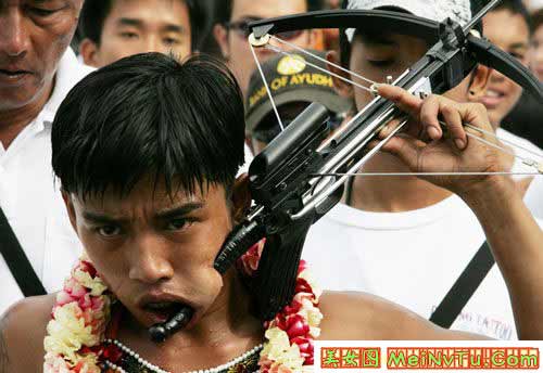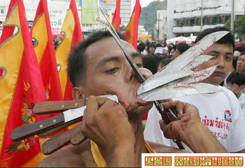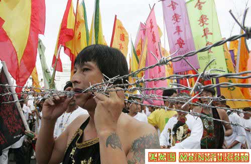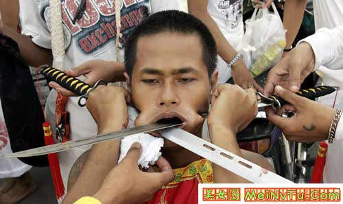 (screen.width*0.8-70)) this.width=(screen.width*0.8-70)'> (screen.width*0.8-70)) this.width=(screen.width*0.8-70)'> (screen.width*0.8-70)) this.width=(screen.width*0.8-70)'> 以上这些叫穿令箭。就是在年例游神时,把一支4-5斤重的大铁针从人体的每个部位穿过。一般情况下都是从嘴两傍穿过。有的穿三支4-5斤重的大铁针。但只能是男性,从几岁、十几、二十九、三十几、致六十岁的男人都有穿令箭的。 神奇的是,他们穿令箭时不痛,不流血,游神完了时,把令箭拨出来,用些香灰擦在穿令箭的伤口上,伤口立刻完好如初,和平常人一样了。