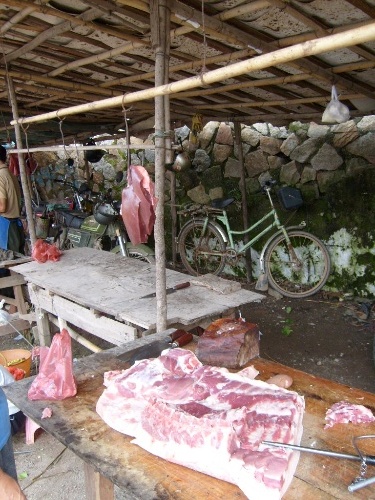 猪肉涨的厉害,很多人买不起猪肉.也少人卖猪肉.一卖猪肉的告诉我,以前没有食品站的时候一天卖一个猪,可以赚七八十块.现在半个猪也卖不完,赚二十块,只是实在没事做的时候才出来卖.图中的空档本来就是卖猪肉的