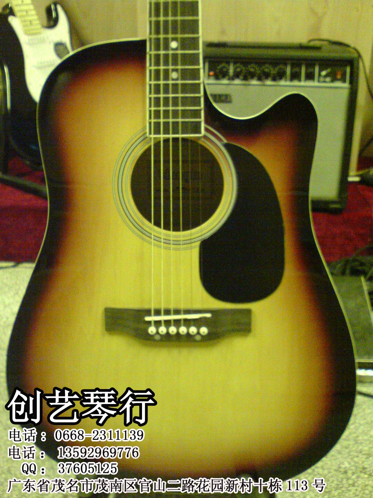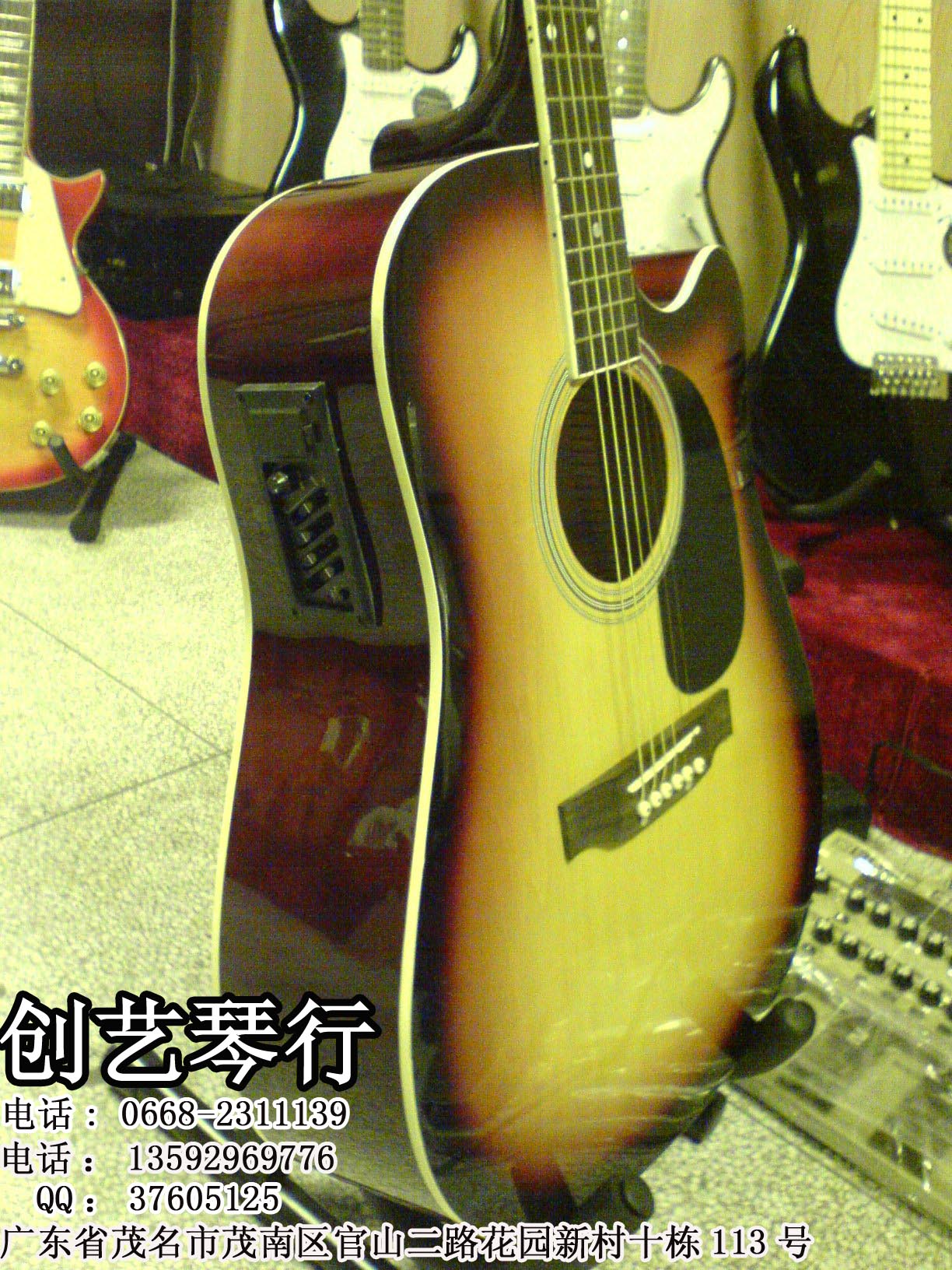 ☆创艺乐器☆高档41寸电箱民谣吉他 580元 送包+被带+拨片 送货到付款 联系方式: 广东省茂名市茂南区官山二路花园新村十栋113号 电话: 0668-2311139 电话:13592969776 客服QQ1: 37605125 ttp://shop.paipai.com/37605125
