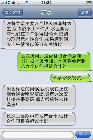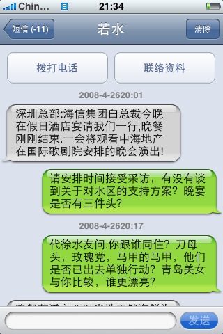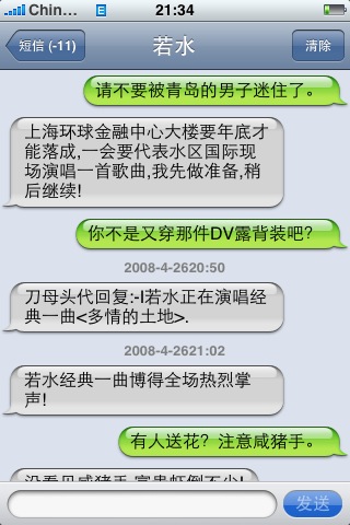 QUOTE(群众 @ 2008年04月25日 Friday, 09:54 PM) 接最新指示,群众代表部分水友对若水版主的访问进行了短信采访. 若水版主访问团一行5人,于今天正式接受Q市知名人士的邀请,将对Q市进行为期5天的短暂访问。 随行人员名单: 刀母头,玫瑰党,马甲的马甲,自动波(女),其余均为内部工作人员。图片为采访内容: [snapback]2209296[/snapback] 来青岛应酬特别多,这两天都来不及上网,私人晚会刚刚结束,现在回到酒店,看看水区就睡觉了,明天还要赶上海。
