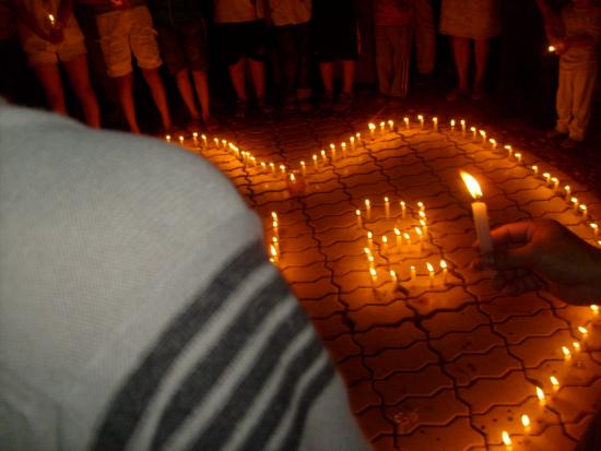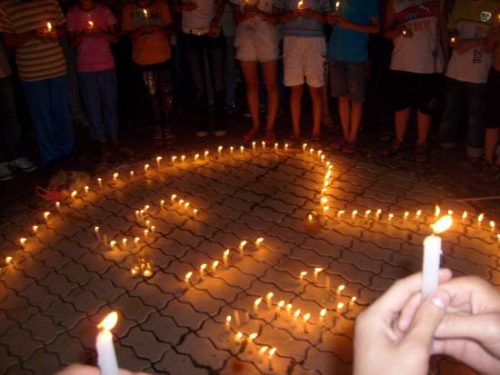 08年5月21日晚9点左右,我经过东湖看到草平那边有些人踹着或站着忙碌,而且还有点烛光,我不由自主地走了过去,看到人们都在用蜡烛在地上排一个还没排完整的心形,就情不自禁地踹了下去帮忙,慢慢的人越来越多,好快地上的蜡烛都排好了,中间还有5.12的字样.大家点燃了地上的蜡烛,很多跟我一样路过的市民都过来领蜡烛,我们拿着手中的蜡烛点燃.开始了,人们都低着头默默地为汶川祈福,为大地震遇难的同胞深切哀悼.数分钟后在一个人(呵呵,不知道这个是谁,反正我不认识)的主持下喊出了口号:中国加油!汶川加油!北京加油!奥运加油!电白加油!