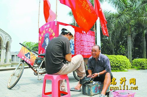 本报记者 郭展 报道 9年来走遍祖国大江南北22个省(自治区),102个城市,为的是宣传雷锋精神。他就是从一个公务员辞职当了擦鞋匠的刘光建师傅。昨日,他踩着自己的“雷锋专”来到了我市市区。