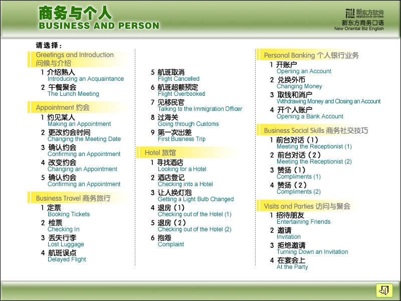 本部分是软件中的重点内容,包括人事管理(面试、工资、培训等方面)、合同谈判、销售与代理、市场、会议、零售、售后服务、参观、电话技巧等十二大类,72课。让你掌握商务人士必备的办公室商务用语,拥有在企业管理、营销等方面的知识技能,成为更专业、更具竞争力的商务人才。