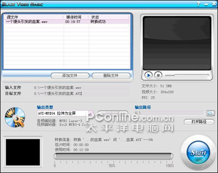 当然,视频文件播放前必须经过软件转换,转换软件为Blaze Video Magic v1.0,界面简单,操作十分方便。该软件可把包括RMVB、RM在内的大多数视频文件转为D220适用的AVI,转换速度则不算太快,使用中需要有点耐性。