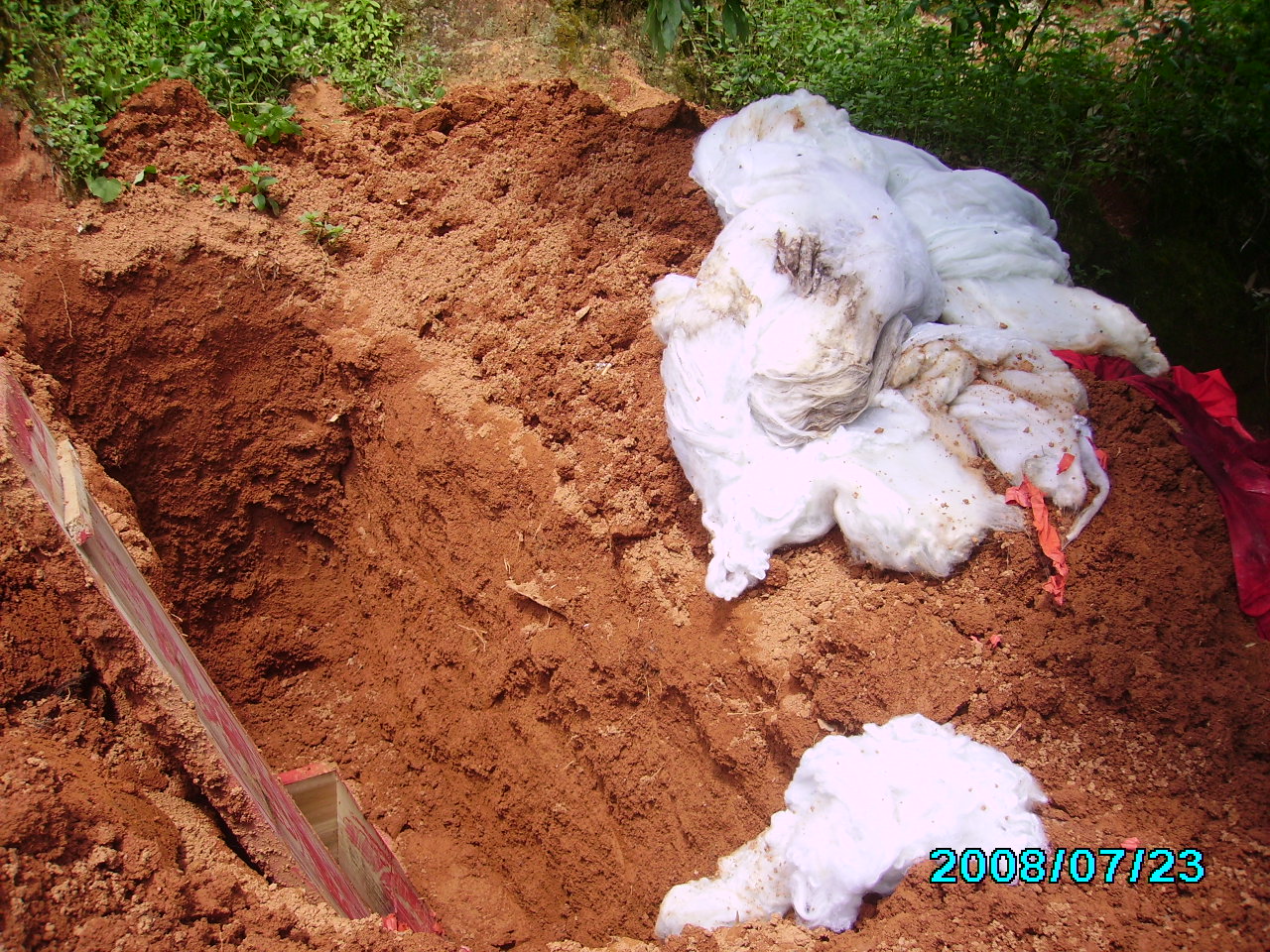 2005年4月7日,广东化州市(隶属茂名市)江湖镇陈谢村侧一荒山上,71岁的村民莫隆盛“扑通”一声,跪倒在一堆黄土前,泪流满面。这堆黄土曾经葬着莫的母亲,如今,坟墓被人偷偷挖开,莫母尸身下落不明。