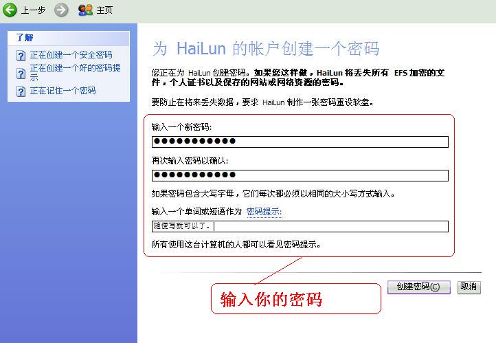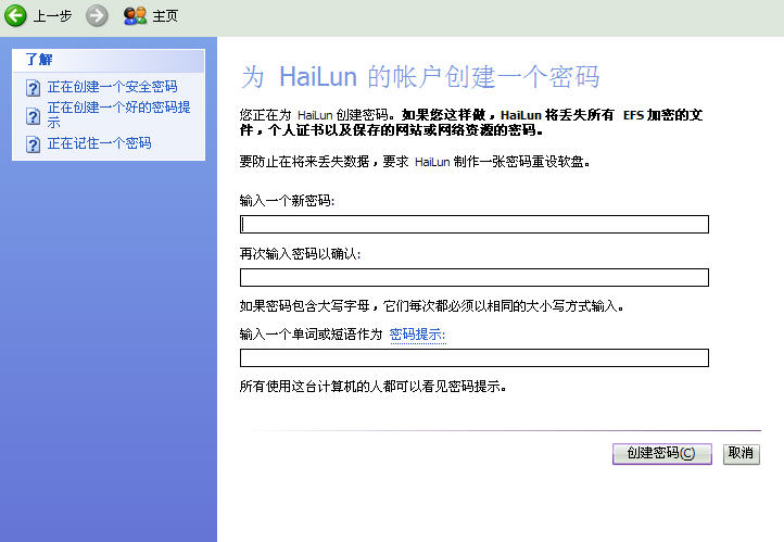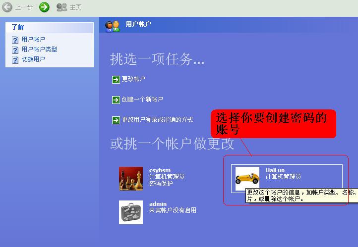 打开:我的电脑--控制面板--用户账号 接着按照一下的图片方法操作。。 [attachmentid=192263] [attachmentid=192264] [attachmentid=192265] [attachmentid=192266]