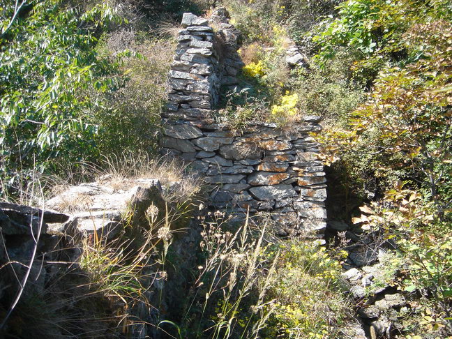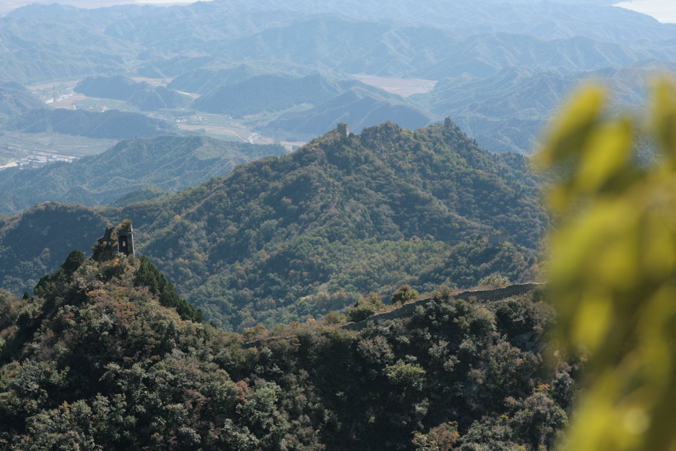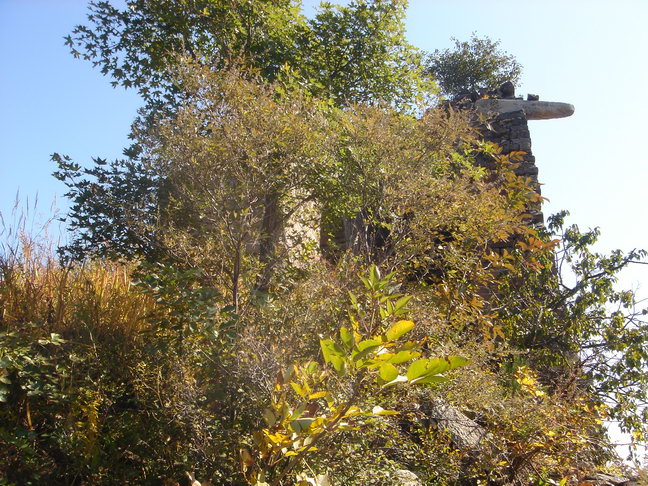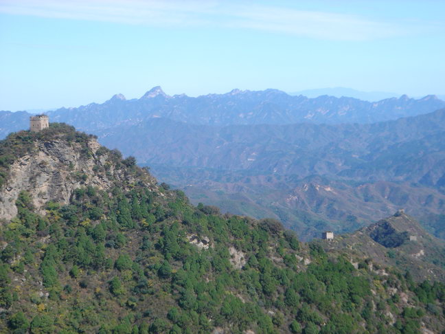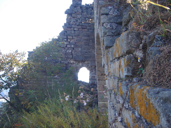 约上午十一点,到山上,爬上破损的石砌长城城墙,见城上的t望墙全部已倒塌,残存的长城长满杂草和灌木,我沿着残存的城墙向山顶的烽火台爬去,约十一点半即到。未停顿继续向另一山顶的烽火台艰难地爬行,约下午一点四十分到达,我一人站在破损的烽火台上,回望,见所爬过的长城完全被覆没在茂密的杂草和灌木丛中,残存的城墙和烽火台若隐若现。远望四周,风景无限,只能看到山下那个十几户人家的小山村,方圆几十公里不再有其它建筑物。阳光、山峦、山林、山风、小鸟、小虫伴随着残存的长城让我感慨万千,历史沧桑,天翻地覆,历史无情让人畏惧,大自然的变迁更令人敬畏……。