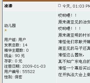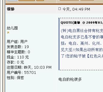 在前几天网上出现过一篇《客观评价下电白县“黑社会”入屋开枪伤人案》的文章。我也曾在上面留言过,说这件事情是有人在网上夸大事实从而在网上炒作。然后就有人在上面留言问我,说我对这件事的了解是多少,我的客观真实版本又在哪?后来我这几天就特别的在网上留意了一下,然后发现一个很奇怪的问题,那就是网络上出现有关《电白县“黑社会”入屋开枪伤人案》的文章,那都是以下这些近排才注册的用户名会员在不断的发表。我想可能就是贴主为了达到在网上炒作的目的。因为深入研究下,就会发现以下这些不同名的用户,都是同一个人的IP,在不断的轮流换用户名发表文章,说话的语气都是出自同一人。在不停的发表不事实的文章,从而达到在网上炒作的目的。