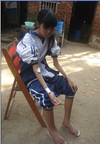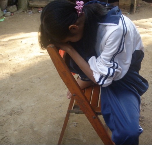 这是她难受的时候,只能这样的姿势座着,不敢站,更加不敢睡,只能这样座。晚上睡觉的时候也是这个姿势睡的。
