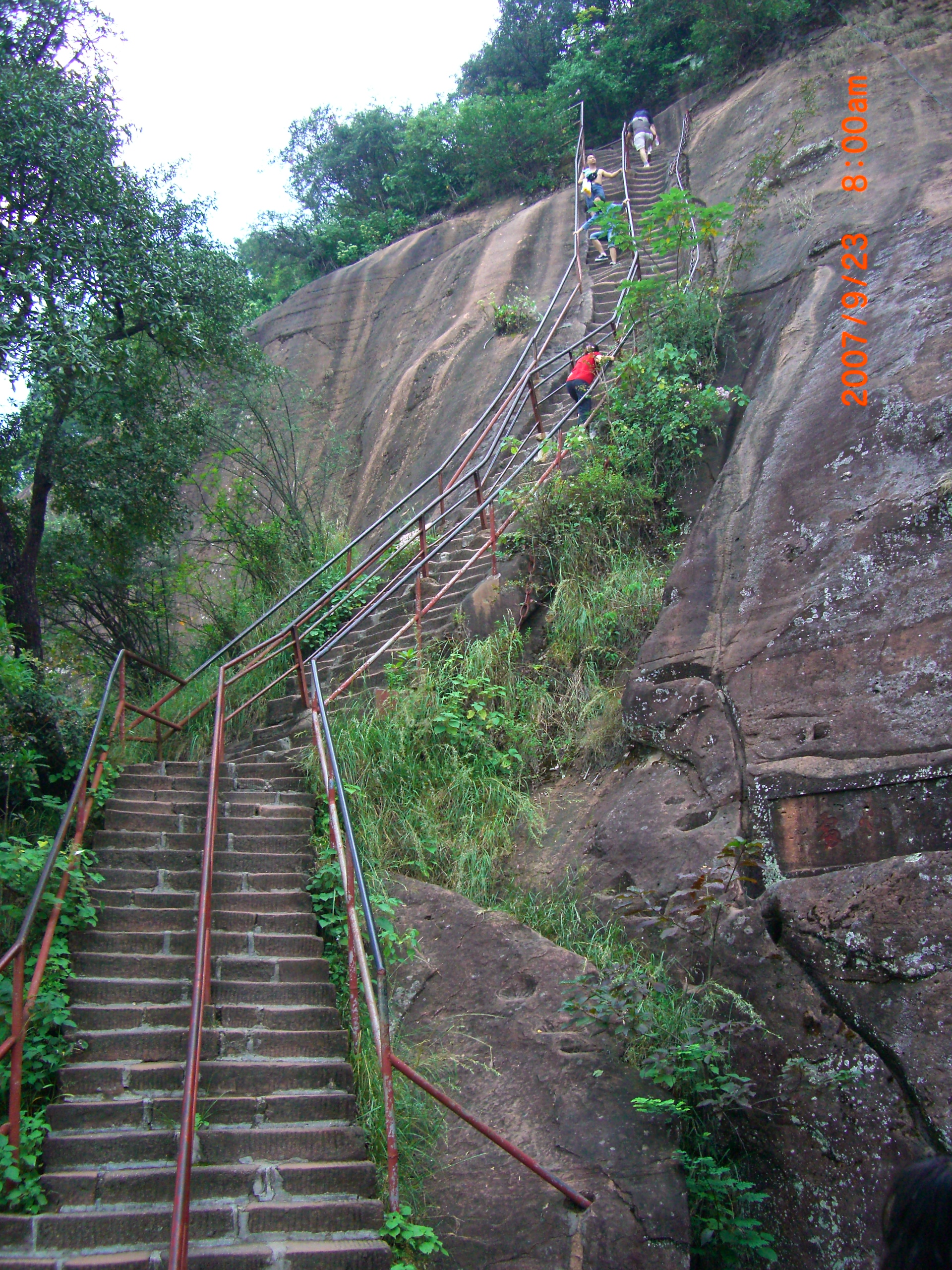 天梯,丹霞山有最好的诠释。人工开凿的红岩阶梯,如一条未经裁剪的红布,直直悬于高峰。顺阶梯而下,眼前没有任何遮掩,脚底仿佛落空,不觉脚软,却震慑于如此之美景,不忍再多看几眼,惊叹大自然造物之神奇。