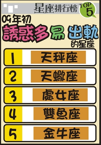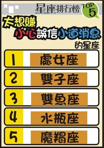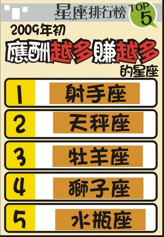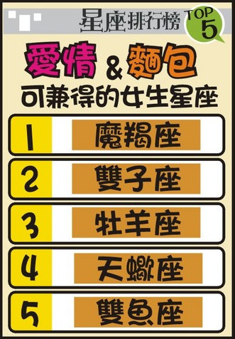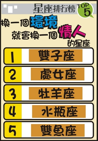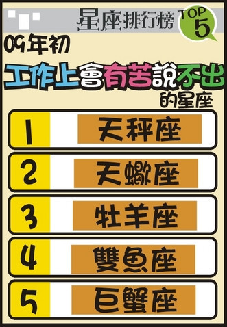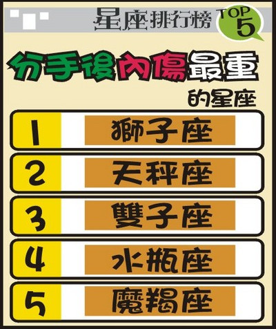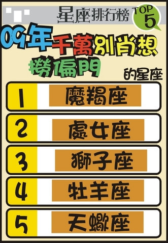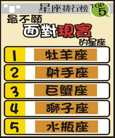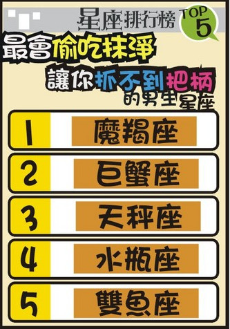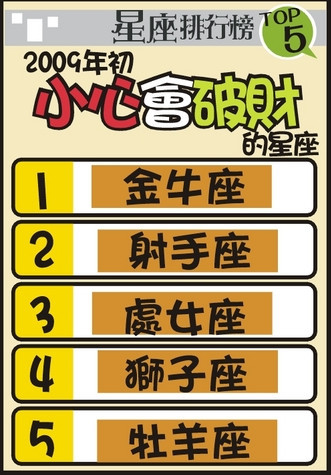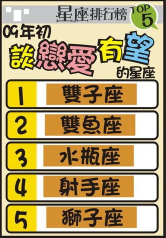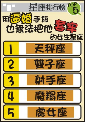 双子座: 1、结婚后有超强帮妻遇的男生星座。。。问题是我是女生! 2、太想赚,小心误信小道消息。。。好像没什么消息啊! 3、事业心强,一再推迟婚姻的女人星座。。。我要是事业心强我家人就该杀猪拜佛了!对象都没,哪来结婚! 4、艳运都在外地的星座。。。真的吗?我没去过外地!不如说在电白! 5、谈恋爱有望的星座。。。叼!竟然还排在第一!我前天刚向喜欢的人表白就被拒绝了!还有望!没望就真! 6、爱情&面包渴兼得的女生星座。。。我现在真的是表白被人拒绝了,口袋又空啊! 7、给他自由反而更爱你的星座。。。确实确实!终于找到个对路的! 8、容易被小人扯后腿的星座。。。不会吧?要多加小心! 9、用逼婚也无法把他套牢的女生星座。。。是我被别人逼婚还是别人逼婚我啊? 10、有本事玩男人的女生星座。。。我没那本事,也没那资本! 11、分手后内伤最重的星座。。。是啊!被拒绝后真的好伤心!好难过! 12、能发桃花财的星座。。。我现在是桃花没了,财也没! 13、买房子时好帮手的星座。。。帮忙花钱吗?这个我会! 14、会有爱神降临的星座。。。应该是爱神逃离的星座吧?! 15、换一个环境就会换一个情人的星座。。。不会吧?竟然排第一!我没那么花心!很专一的我! 16、未进们就不讨喜的媳妇星座。。。呜呜、、不会吧!我有那么讨人厌吗? 17、有机会靠兼差捞一笔的星座。。。貌似我没那个能耐也没那个时间! 18、工作上会被迫收拾烂摊子的星座。。。会吗?那么倒霉啊?目前没出现! 19、说谎不眨眼的星座。。。其实我很诚实的!竟然这样说我!真是伤害我幼小的心灵! 终于都完了! 好像都是挺倒霉的!唉。。欲哭无泪。。