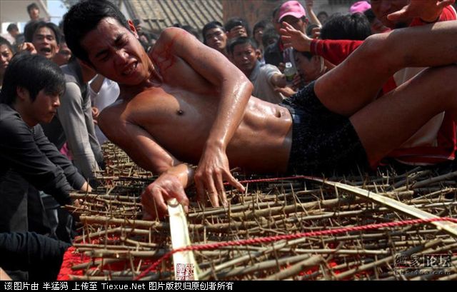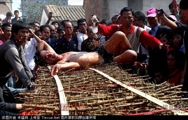 翻刺床就是将葡萄牙刺扎成一张床,勇敢的村民脱光衣服在床上翻滚。翻刺床在这里不叫表演。