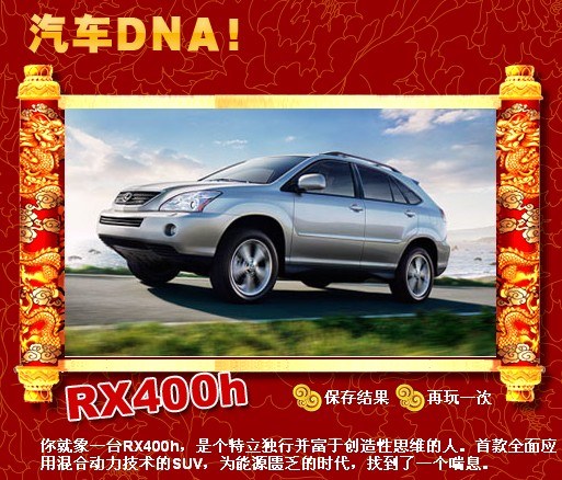 这个测试很有意思,配图也还蛮好看的,不过这个不重要,最重要是内容,又测人格又测运程又测适合的车型。其他什么的我就不关注了,鄙人最关心的就是自己最适合哪台车。话说汽车这玩意不比手机棒棒糖,不好就随便换一个,毕竟俺们是穷人么,本来就买不起,就算咬牙买一台也需要大大的斟酌,肯定不能看哪个顺眼就买哪个呢,当然要讲求适合