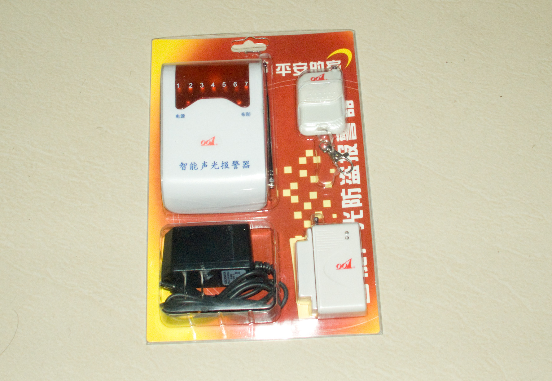 此款智能报警器标配有门磁一套、遥控器一个、变压器一个、主机一台,可以额外加入四个红外探头增加防区防盗。