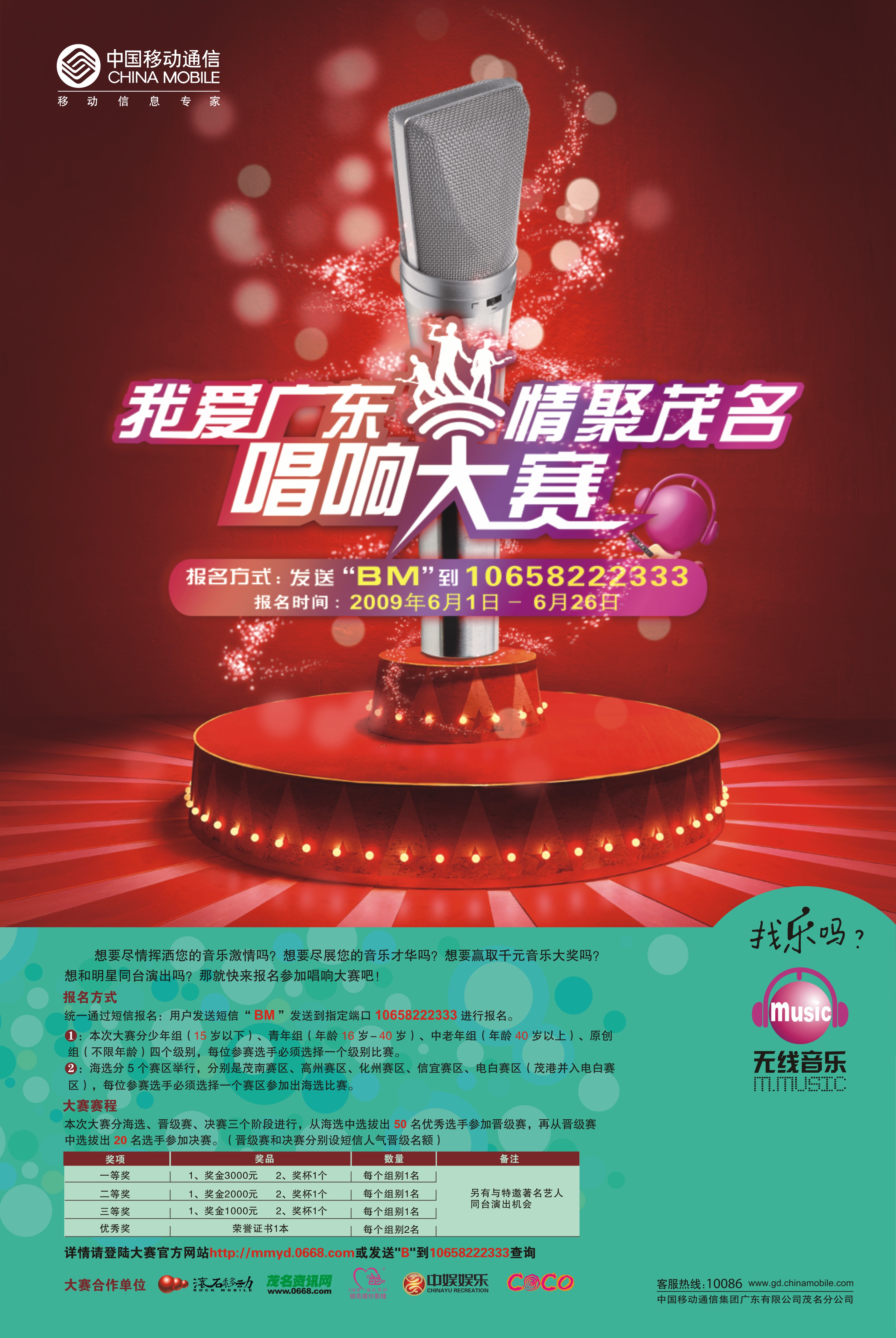 屺懔髂軎舂m 小学一年级 注册 2008-09-19 消息 131 反馈评分 0 点数 0 2009-06-04 #1 “我爱广东・情系茂名”唱响大赛火热报名中... [attachmentid=214523] 内容看不清楚的可到中国移动服务厅咨询或登陆官网:http://mmyd.0668.com 附件 海报570X860MMv8.jpg 1.7 MB · 查看: 847