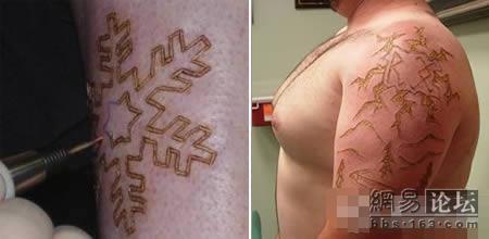 打烙印 这是所有文身中最疼的一种。用来打烙印的铁制工具温度相当高,并且一般需要花费很长时间才能完成。最终,打了烙印的皮肤相当于三级烧伤的程度,而且再也不会有灵敏的触觉了。由于这种文身技术破坏了皮肤的整个真皮层,因此恢复起来特别缓慢,大概需要几年的时间。