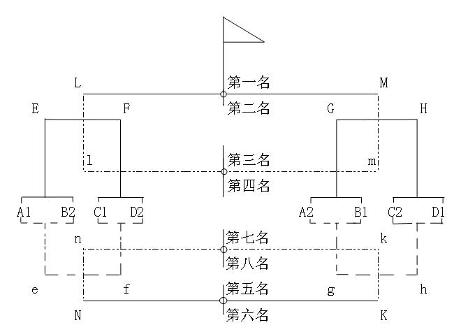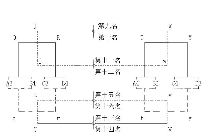 机关组:比赛分两个阶段进行,第一阶段分A、B、C、D四个小组采用单循环赛制,第二阶段每小组前1、2名进行交叉淘汰赛制决1至8名(图1);每小组3、4名交叉淘汰赛制决9至16名(图2)。
