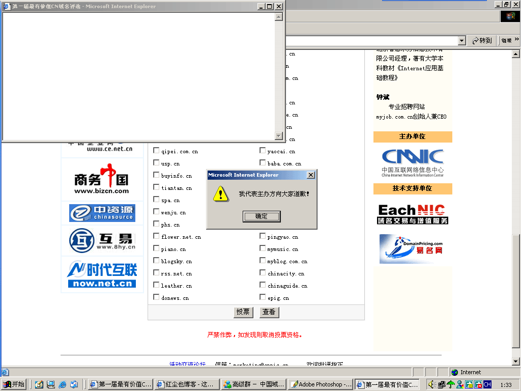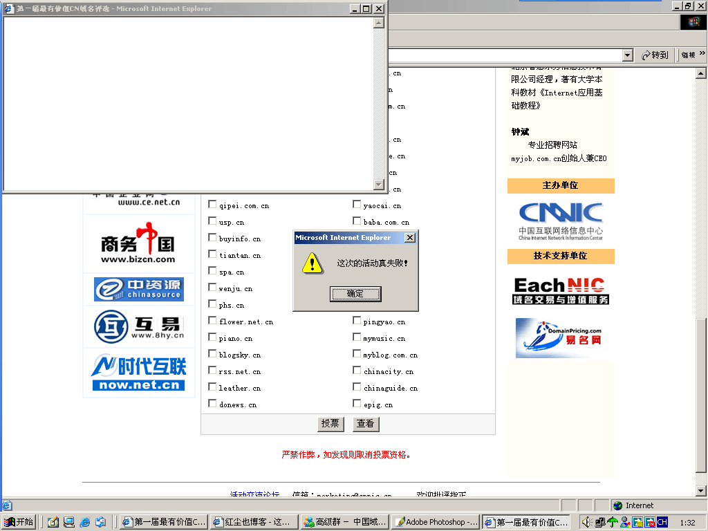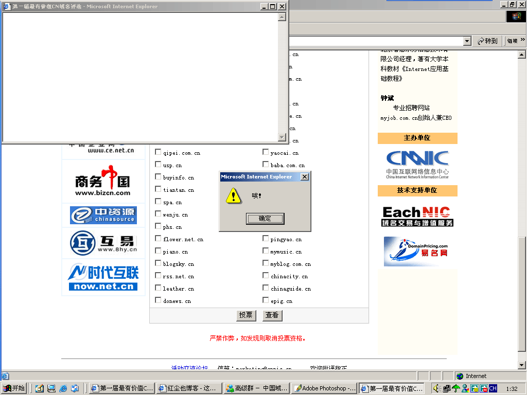 红尘在QQ群里收到消息说“第一届最有价值CN域名评选”的主办网站http://www.domain.cn被黑了,于是第一时间赶到现场查看,在点击投票的时候弹出如下一连串的提示,最后本该弹出投票结果的页面显示的是域名玩家在易域网(www.eachnic.com)对此次评选的评论页面,该页面链接地址为:http://www.eachnic.com/club/ShowForum.asp?forumid=24(以下为每次弹出提示页面的截图)