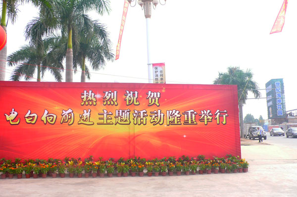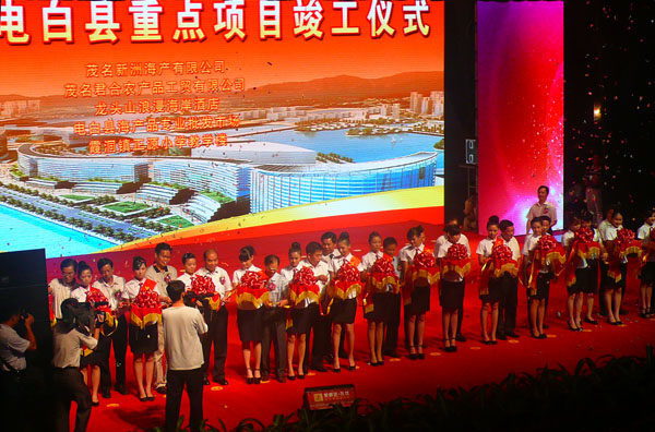 8月30日上午9时正,电白县委县政府在县大会堂举办“电白向前进”的主题大会,包括重点项目推介、签约、动工、剪彩仪式和“发展电白”主题演讲活动。活动由中共县委副书记、县长丁锦文主持。与会嘉宾有:王兆林,许光辉,倪增,蔡端丰,刘敏,除巧文,凌瑞俊,严保伦,梁毅民,吴兆奇,李喜气,林日娣,陈淑芬,刘九权,潘本等。此次活动是共商电白的发展大计,营造“解放思想、争先进位、跨越发展”的良好氛围,加快推进招商引资和项目建设工作建设,将掀起电白新一轮发展热潮。 大会由中共茂名市委常委,电白县委书记李玉楷致词,殷切地寄语滨海新区;中共茂名市委常委,秘书长陈淑芬发表重要讲话。 接着大会举行“发展电白”主题的演讲活动。茂名新洲海产有限公司总经理陈振亮、振兴电白广州联谊会会长李琼兴、中山大学教授倪兆球、第十一届省人大科教文卫委会主任,原茂名市委常委,电白县委书记许光辉作为代表进行演讲。 在一片热烈的掌声中,大会隆重推出的“五区一园”等多个重点建设项目主要涉及经济、社会及民生领域,包括:水东湾中央行政商务区、电白县滨海风情旅游度假区、电白县综合物流区、电白县鼓楼教育园区、电白回归创业园区,水东湾海洋公园。 随后大会进行项目签约,成功签约的项目35个,涉及工业、农业及深加工、旅游业、教育、物流、基建(道路、公共场馆市政建设)、房地产等数十个重大项目,其中有海洋生物科技产业园项目,茂名市海洋生物科技研发中心项目。总投资超百亿,预计投产后年税收可达30亿元,将提供就业岗位20000多个。 大会还为已经竣工的五个项目举行剪彩仪式:具体为新洲水产品项目;茂名市君公农产品工贸有限公司项目;龙头山浪漫海岸酒店项目;电白县海产品专业批发市场项目;霞洞镇正源小学项目。投资总额约15亿元,投产后预计年税收7000万元,可提供就业岗位5000个。 最后,在海景明珠广场为即将动工的项目进行奠基总仪式,顺利完成大会的各项议程。奠基总仪式由电白县委常委常务副县长庞进生主持,县四套班长成员,县法院院长,县检察院长,各镇党委书记,镇长,县副科级以上单位主职领导,重点项目投资建设单位及特邀嘉宾等参加。