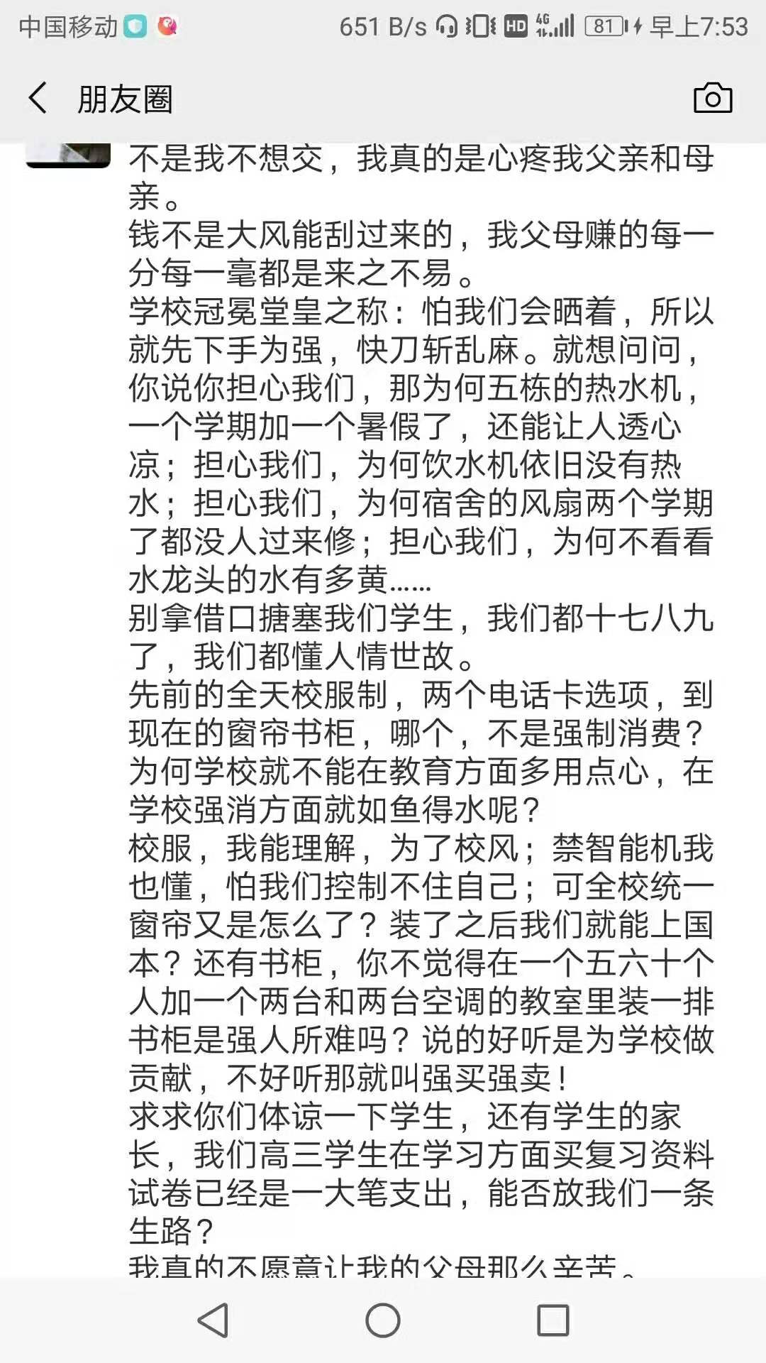 如果你真的是家长的话也要问问孩子有没有夸大其词,一个学校学生在校期间穿好校服再也正常不过吧,为什么在我们这里想管理好都那么难呢?我觉得要是做到学校啥都不敢去管的话那也是很寒心了水东中学吧,太恶心了,我有一个孩子在高三16班,过节放假回来讲,三个级长都强迫他们买校园卡,还不能买30元的,一定要买80元的带话费的。如果不想买就要叫家长到学校来签名。否则就记分扣留档案,不给他们毕业。一方面不给他们用智能手机,一面在微信上布置功课。。。。他们不用智能机能上微信做功课吗??上次不是叫我们家长把他们的手机都换成老人机了吗,不给他们用智能机,我们非常理解,全都赞成换了,但是现在又来这个就想不明了。本来他们高三可以不穿校服的,因为前几届都一样不穿。到他们这届就硬迫他们买???他们的班窗帘好好的,只是不同色,硬要他们换成同色的和买书柜。窗帘不改成同色的也不行,他们想自己换成同色的也不行,一定要学校换,这个我就想不明白了。太多太多了,不想讲了,作为家长,我们只能呵呵了